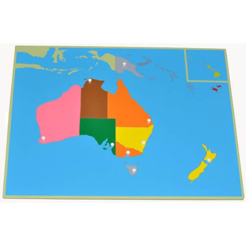 Картата се състои от рамка с размери 58х45 см и девет елемента с формата на територии от област Океания. На всека елемент има малка пластмасова дръжчица, с която подреждането на отделните части на пъзела е лесно и удобно. Всяко парче от пъзела се поставя на специално изрязано място в рамката, което съответства на неговото място.Чрез работа с Картата на Океания детето научава имената, формата и разположението на държавите. Освен това се дава една много добра основа, която след това да помогне на децата при изучаване на география в училище.Подходящо за деца над 4 години. Преди заниманията с Картата на Океания е хубаво детето да се запознае с Картата на света.Размери: 58,5х45,5х3 см, тегло: 2 кг.Внимание: Продуктът съдържа малки елементи, които могат да бъдат погълнати!Smartbaby предлага широка гама от Монтесори материали и играчки.