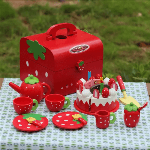 Този очарователен дървен чаен сервиз с ягодова тематика ще зарадва всяко дете и ще бъде чудесно допълнение към всяко чаено или рождено парти. Яркото червено и сладките ягодови мотиви правят сервиза не само красив, но и весел, идеален за създаване на забавни игри и спомени. Комплектът е с изключителен дизайн, пълен с детайли и идва в практична дървена кутия за съхранение и пренос.Изработен от висококачествено дърво и боядисан с нетоксични бои, този сервиз е безопасен за малките ръчички. В комплекта ще откриете всичко необходимо за едно прекрасно чаено парти – декоративна торта, чаши, чинийки, чайник, млекарка и вилици. Той е готов за игра без нужда от сглобяване и е идеален за развиване на въображението и социални умения у децата. Манипулирането с малките части на сервиза подпомага развитието на фина моторика и подобрява координацията между ръцете и очите.Основни характеристики:Изработен от висококачествено дърво с нетоксични бои, безопасен за деца.Съдържа декоративна торта (12 см), 2 чаши с чинийки, чайник, млекарка, 2 вилици и дървена кутия за съхранение.Ярко червен цвят с сладъ...