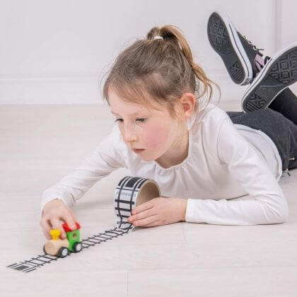 Детски релси тиксо с дървен локомотив Bigjigs ще грабне вниманието на всяко дете. С това издръжливо тиксо ще създадете изцяло нова железопътна мрежа, която може да е различна всеки ден. Просто се отлепя и се придържа към повърхността. Тиксото е подходящо за подове, стени и мебели, като се отделя лесно и не оставя следи, остатъци и не поврежда повърхностите. Играта с детски релси тиксо с дървен локомотив Bigjigs ще насърчи въображението и ролевата игра. В комплекта има и дървено локомотивче, което да се движи по релсите. Посочената цена е за 1 брой. Разгледайте още продукти в категорията "Дървени влакчета" - ТУК! Комплектът съдържа: тиксо и локомотив.