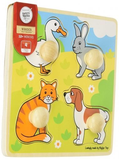 Моят първи дървен пъзел с дръжки Домашни любимци Bigjigs е вече тук! Патето, зайчето, котето и кучето искат да си играят на двора, но за целта, трябва да бъдат поставени на правилните места. Всяка част от пъзела на Bigjigs разполага с удобна за детските ръчички дръжка, правейки подреждането по-лесно и забавно, а под всяка част има любимото нещо на всеки един от домашните любимци. А след като подредите пъзела, ще можете ли да покажете на мама и тате какви звуци издава всяко едно от животните? Моят първи дървен пъзел с дръжки Домашни любимци Bigjigs развива фините моторни умения, логическото мислене, координацията и наблюдателността. Изработен е от дърво и е боядисан в много свежи цветове с нетоксични бои, напълно безвредни за мъниците.Посочената цена е за 1 брой. Разгледайте още продукти в категорията "Дървени пъзели" - ТУК! Комплектът съдържа: поле за нареждане и 4 части.