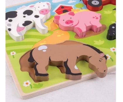 Дървен пъзел с фигурки Ферма Bigjigs е вече тук! Мъничето Ви ще се запознае с любимите на всички животни от фермата - прасето, кравата, овцата и кончето, а около тях е и тракторът, който пренася сеното в обора. Животните са под формата на удобни за хващане фигурки, които трябва да бъдат поставени на картинката, съобразявайки се с формата на дупката, но с тях може да се играе и извън пъзела. След като бъде подреден пъзелът, детето може да покаже и звуците, които издават животинките. Дървен пъзел с фигурки Ферма Bigjigs е изработен от дърво и е боядисан в много свежи цветове с нетоксични бои, напълно безвредни за мъниците. Посочената цена е за 1 брой. Разгледайте още продукти в категорията "Дървени пъзели" - ТУК! Комплектът съдържа: поле за нареждане и 5 части.