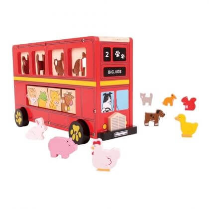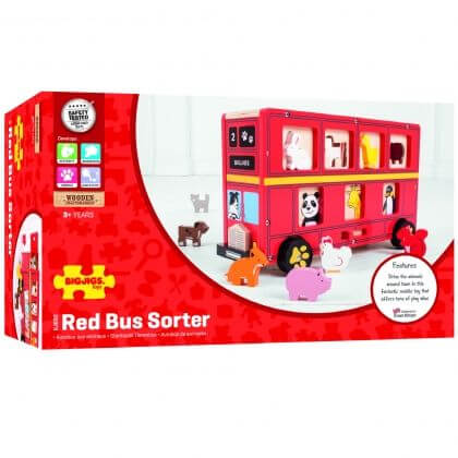 Детски дървен сортер Червен автобус Bigjigs е страхотен подарък. Карайте цветната колекция от дървени животни из града с този красиво изработен автобус. Животните се поставят на правилните места отстрани. Пътниците от горната част могат да минат в долната чрез плъзгача. В края на пътуването си животинките могат да слязат през задната част на автобуса. Заниманията с детски дървен сортер Червен автобус Bigjigs сортера ще насърчат наблюдателността, сръчността и комуникационните умения. Посочената цена е за 1 брой. Разгледайте още продукти в категорията "Дървени низанки" - ТУК! Комплектът съдържа: 21 части за подреждане
