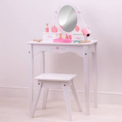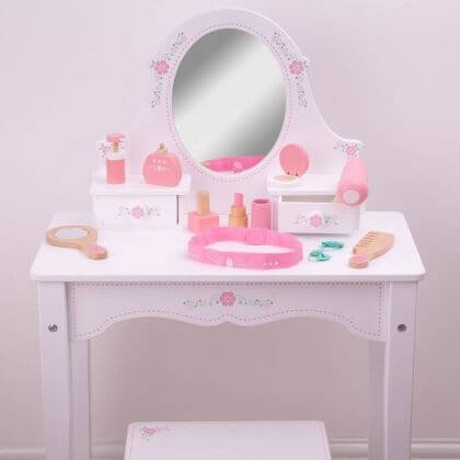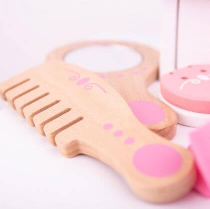 Чудесен детски дървен козметичен комплект в несесерче Bigjigs. Като всяка малка госпожица, и Вашата принцеса има желанието бързо да навлезе в света на възрастните. Има много време до този момент, затова дотогава, козметичният комплект на Bigjigs ще бъде достатъчен, за да може момиченцето Ви да се докосне с интерес в бъдещето. Козметичните принадлежности са изработени изцяло от дърво, което обещава безопасност по време на игра, но ластичетата, лентата за коса и огледалцето са напълно функционални. Всичко това идва в красиво розово несесерче на бели точки, затварящо се с цип. Игрите с детски дървен козметичен комплект в несесерче Bigjigs ще стимулират ролевата игра и въображението на децата. Изработката е от висококачествени и напълно безвредни материали. Посочената цена е за 1 брой. Разгледайте още продукти в категорията "За детската стая" - ТУК! Комплектът съдържа: дървена козметика, 2 ластичета, лента за коса и огледалце.