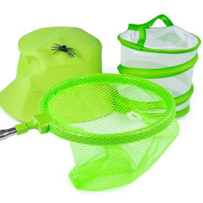 Комплект за деца за лов на буболечки Bigjigs. Малките ловци на буболечки могат да изпробват уменията си за дивата природа с нашия зелен комплект за лов на насекоми Explorer. Включва зелена шапка-кофа, изскачаща мрежа против насекоми, чифт бинокъл, телескопична мрежа, лупа и др. Използвайте разтегателната телескопична мрежа, за да уловите красиви пеперуди; бинокълът за наблюдение на птици и насекоми отдалеч; шапката, за да ви помогне да се слеете с природата; капанът за насекоми за нежно улавяне на насекоми; и лупата за изследване на буболечките отблизо. Детските комплекти за улавяне на буболечки са чудесен начин да изведете децата навън, близо до природата и да се насладите на чист въздух. Нашият сет за лов на буболечки е направен от висококачествени, отговорно произведени материали, които отговарят на настоящите европейски стандарти за безопасност. Разгледайте още продукти в категорията  "Играчки за навън" - ТУК!