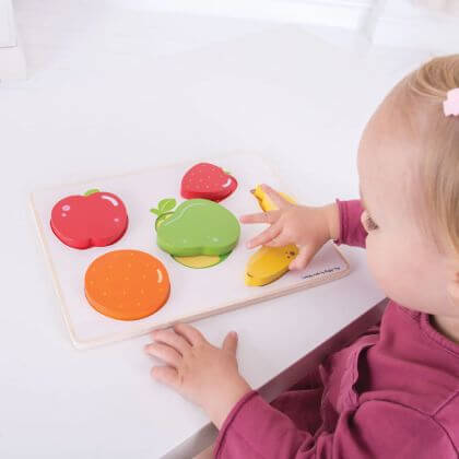 Детски дървен сензорен пъзел "Вдигни и виж" - Плодове - BIGJIGS