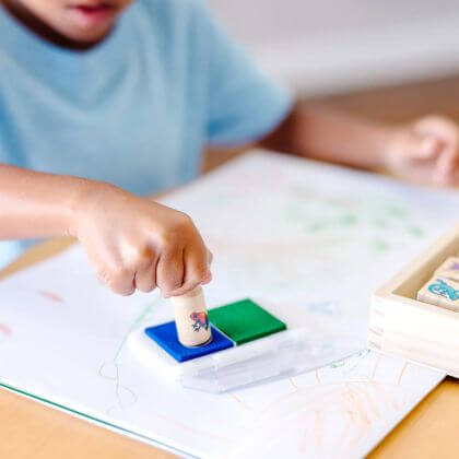 - подходящ за възраст: 4 до 7 години - включва 20 печата, 5 цветни молива, издръжлива двуцветна подложка за печати и дървена тава за съхранение. - материал: дърво