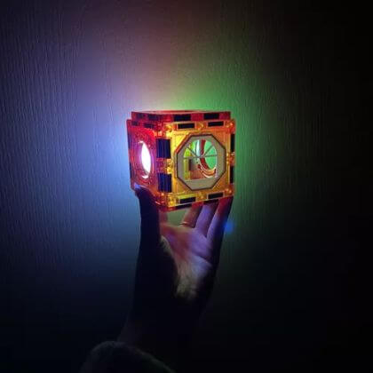 Възраст: 3+ години Брой: 77 части Размери: 31 х 25 х 8 см Размери на квадратно блокче: 6,5 х 6,5 х 0,6 см Материал: Пластмаса и магнит Светещи елементи: да Време за доставка: Един работен ден