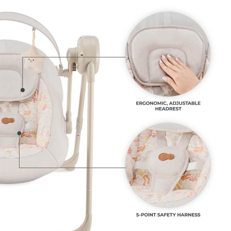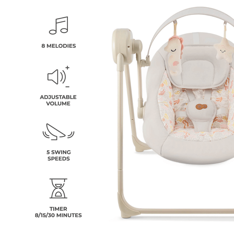 Основни характеристики SWINGEE може да служи като класически шезлонг или електрическа люлка с автоматично люлеене. Едно универсално решение, което се адаптира към ежедневния ритъм на бебето. SWINGEE разполага с 3 начина на захранване– чрез електрическата мрежа, пауър банк или батерии. 5-степенно регулиране на люлеенето с таймер Функцията за люлеене ви позволява да избирате от 5 нива на скорост, за да отговарят на нуждите на вашето бебе. Таймерът (8, 15 или 30 минути) завършва сесията автоматично, поддържайки ритъма на бебето. SWINGEE разполага и с 8 вградени мелодии, 3 от които звуци от природата. Лек, сгъваем дизайн С тегло от само 3,7 кг и проста система за сгъване, SWINGEE е перфектен както у дома, така и на почивка. След като се сгъне, заема изключително малко място, което го прави идеален за съхранение и транспорт – чудесен за активни семейства. Безопасност и комфорт Ергономичната, регулируема облегалка за глава и 5-точковият колан с меки подложки осигуряват стабилна опора и безопасно позициониране. Вашето дете може да почива комфортно и безопасно – независимо дали се люлее или лежи непод