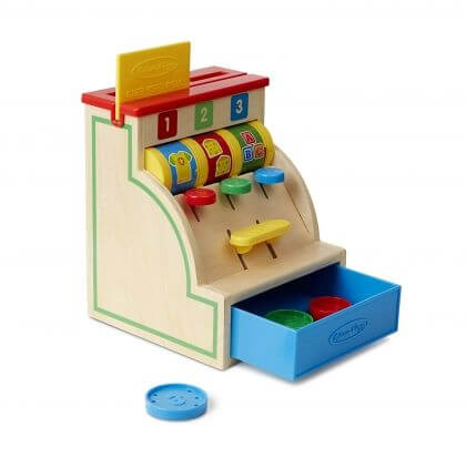 Подходяща възраст: 3+ Размер на играчката: 16.5 см x 16.5 см x 22.9 см Материал: Дърво Комплектът съдържа: 5 части (касов апарат, 3 монети и кредитна карта) Време за доставка: Един работен ден