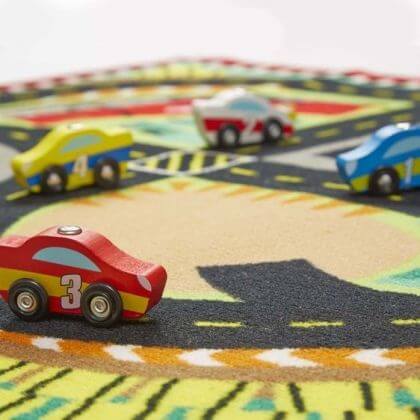 Детско килимче за игра писта с дървени коли Melissa & Doug е страхотна идея за подарък. Готови ли сте за състезание? Подредете се на стартовата линия... готови.... старт! Кой ще стигне първи до финала? Чакат Ви множество игри с цветното килимче, което може да бъде и интересна добавка към интериора на детската стая. То е в комплект с 4 състезателни колички, които са изработени от дърво и са в 4 различни цвята и по номера. Състезателната писта е подходяща за четирима играчи, като играта ще развие фината моторика, въображението, състезателния дух и ролевата игра на малките състезатели. Детско килимче за игра писта с дървени коли Melissa & Doug е изработено от издържливи материали и може да се пере. Посочената цена е за 1 брой. Разгледайте още продукти в категорията "Детски килимчета за игра" - ТУК! Комплектът съдържа: килимче и 4 дървени колички.