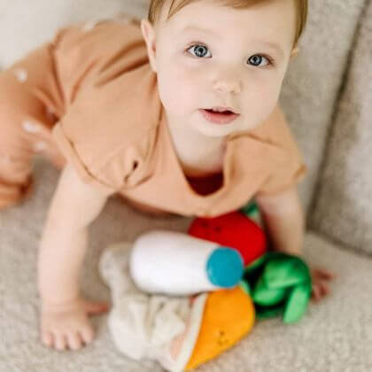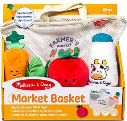 Подходяща възраст: 0+ Материал: Текстил Размер на продукта: 15.62 x 28.32 x 25.4 см Комплектът включва: 5 части (пазарска чанта, плюшена бутилка за мляко със звънче, интересна зелка, дрънкащ мек домат и скърцащ морков) Време за доставка: Един работен ден