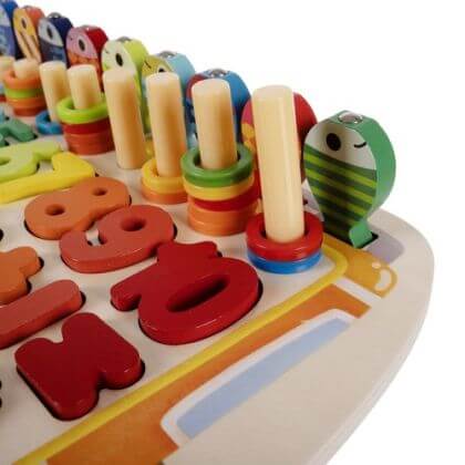 ✅ Възраст: 3+ ✅ Съдържание: дървена основа, въдица, лъжица, пръчици, 10 рибки с магнит, 3 математически знака, 10 цифри, 7 фигури, 55 кръга, 9 пъзела с превозни средства ✅ Материал: дърво ✅ Размери: 41 х 22,5 х 6 см ✅ Помага за развитие на концентрация и търпение ✅ Подпомага ученето на числа, форми и основи на математиката ✅ Развива фината моторика и координация око-ръка ✅ Идеален за забавление и учене по време на игра