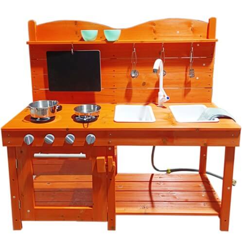 Дървен детски комплект за игри и забвления на момичета и момчета. Кухнята и всички аксесоари към нея са подходящи за игра навън.Комплектът включва:дървена кухня, подходяща за външни и вътрешни условия на експлоатация;метално тиганче и тенджерка;метални прибори за готвене - черпак, бъркалка, шпатула;контейнер за вода;пластмасови купи;кухненеска кърпа;инструкции за сглобяване;маркуч и спирателен кран, за включване във водопреносната система.Детската кухня е оборудвана с:две мивки с възможност за включване към водопреносната система;котлони и копчета за въртене;фурна с вратичка;дървена черна дъска за писане;поличка, на която могат да се подреждат прибори и посуди.При игри и знаимания с кухненеските комплекти, у децата се развиват социални умения. Този тип ролеви игри, помага на децата да влязат в определена социална роля, съпътстваща определен начин на поведение. Това развива творчеството и креативността у децата, както и поведение и отношение към другите участници в играта.Чрез игра с дървени кухни, у децата се заражда интерес към заобикалящите ни ежедневни навици и дейно...