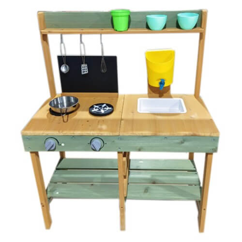 Дървен детски комплект за игри и забвления на момичета и момчета. Кухнята и всички аксесоари към нея са подходящи за игра навън.Комплектът включва:дървена кухня, подходяща за външни и въррешни условия на експлоатация;метално тиганче;метални прибори за готвене - черпак, бъркалка, шпатула;контейнер за вода;пластмасови купи.Детската кухня е оборудвана с:мивка и контейнер, в който се слага вода;котлони и копчета за въртене;дървена черна дъска за писане;поличка, на която могат да се подреждат прибори и посуди.При игри и знаимания с кухненеските комплекти, у децата се развиват социални умения. Този тип ролеви игри, помага на децата да влязат в определена социална роля, съпътстваща определен начин на поведение. Това развива творчеството и креативността у децата, както и поведение и отношение към другите участници в играта.Чрез игра с дървени кухни, у децата се заражда интерес към заобикалящите ни ежедневни навици и дейности вкъщи. Те биха искали да видят какво правят родителите им в кухнята, а защо не и да станат наши неизменни помощници.Специфицация на комплекта:Размери на кутията: 98...