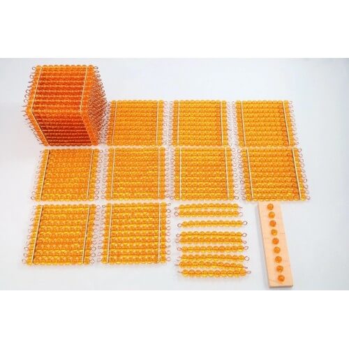 Introduction To The Decimal System или Златен комплект на Монтесори за въвеждане и обясняване на десетичната бройна система.Комплектът включва: - куб от 1000 мъниста - хилядни - 1 бр;- квадрат от 100 мъниста - стотици - 9 бр;- наниз от 10 мъниста - 9 бр;- отделно мънисто - 9 брС помощта на този продукт децата се научават по-лесно на действието умножение.Заниманията с този продукт, пораждат у децата интерес, както и развитие на логическото мислене и по-лесно осмисляне на десетичната система, също така и осъзнаване в разликата на големините на числата. Разбиране какво е разряд на числата, както и осъзнаване защо в десетичната система най-голямото число е 9Размери на един наниз: 8 cм.Тегло: 250 гр.Първите занимания с този продукти, са подходящи за деца над 4 години..Внимание: комплектът не съдържа дървената поставка от първата снимка!Внимание: Продуктът съдържа малки елементи, които могат да бъдат погълнати!Още много Монтесори материали, свързани със сензорното развитие, математика или околен свят, можете да намерите на линка..Smartbaby предлага качествена литература за малки и големи, Монтесори материали и играчки, д