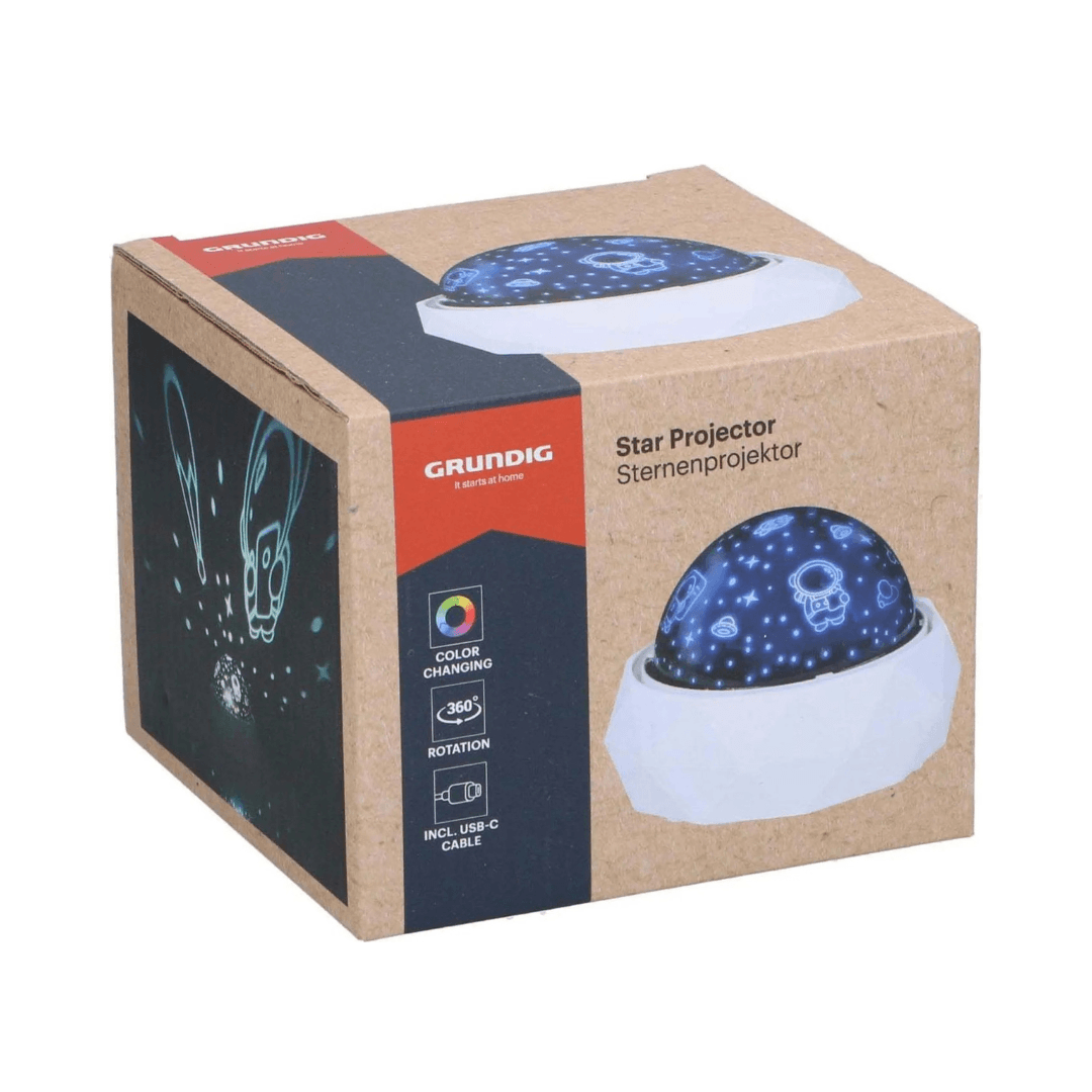 Внесете нощното небе директно в стаята на детето с помощта на новия проектор Grundig Star. Движещите се проекции на звезди и астронавти създават успокояваща атмосфера на стената или тавана. Идеален като нощна лампа или декоративно осветление в детската стая. Компактният му размер го прави лесен за пренасяне и гъвкаво използване. Предимства на проектора Grundig Star Цветна проекция на звезди и космически мотиви Завъртане на 360 градуса за динамични ефекти Автоматична или ръчна смяна на цвета Зарежда се чрез USB-C (кабелът е включен) Лесно управление с един бутон Спецификация: Проекция: Звезди и космически фигуриЗавъртане: 360 градусаЦветове: сменящи се автоматично/ръчноЗахранване: Зарежда се чрез USB-C Размери: 11,5 x 11,5 x 9 см Тегло: 0.16 kg Управление: Система с един бутон Информация за безопасност: Деца под 3 години да не работят с уреда без родителски контрол